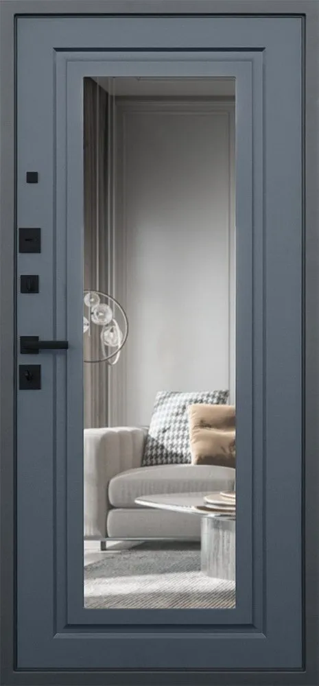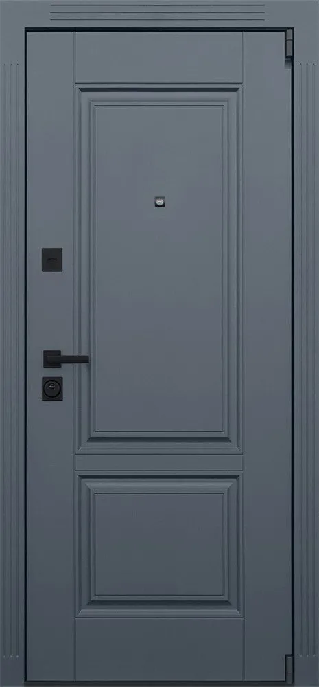 Порошковое покрытие "муар серый". Панель МДФ 16 мм. Объемная фрезеровка. Цвет "графит". Наличник МДФ: толщина 16 мм, ширина 85 мм.