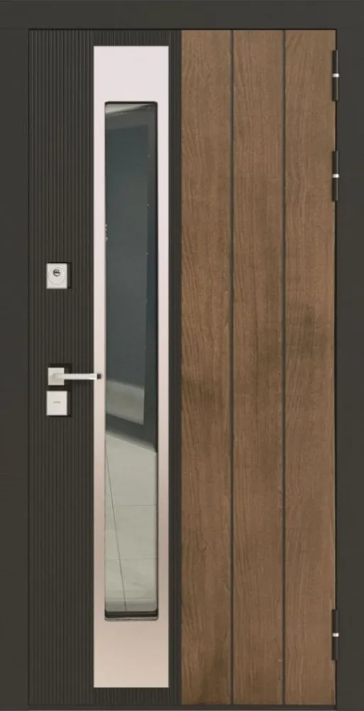 Отделка: снаружи - МДФ панель 16 мм влагост., орех американский, патина черная, черная шагрень накладка - нерж. сталь шлифованная Изнутри - МДФ панель 10 мм белая шагрень, металл. вставка вокруг стеклопакета (черный муар)