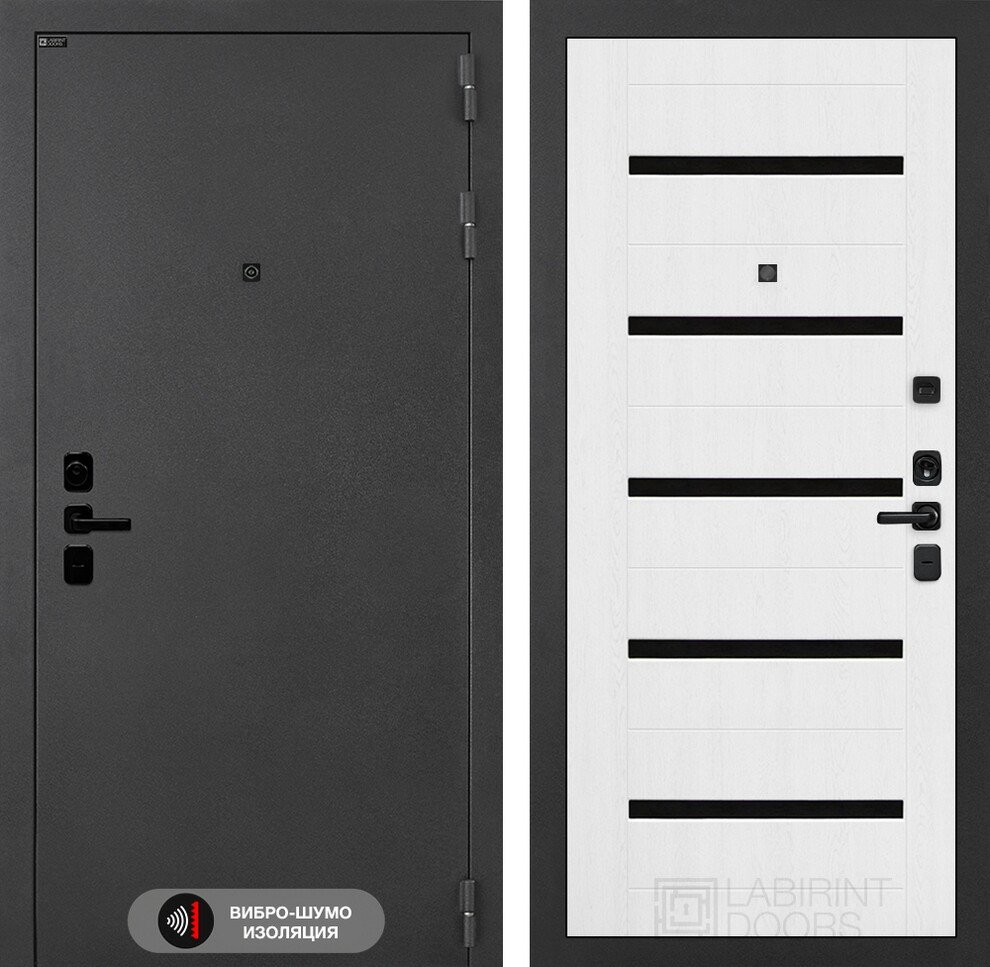Фурнитура в черном цвете: Броненакладка врезная, накладка со шторкой, глазок , дверная ручка, ночная задвижка. Цилиндр ключ-вертушка Apecs, регулируемый эксцентрик.